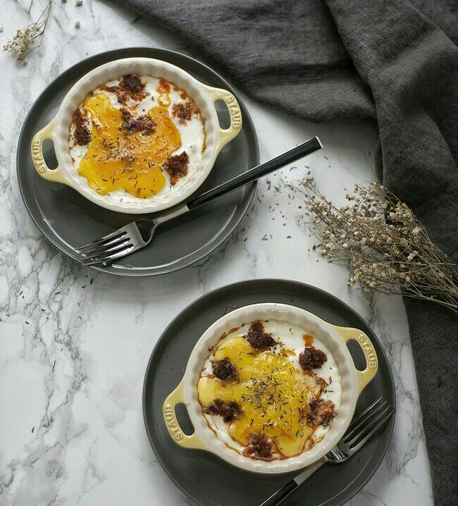 Las sacamos del horno, ponemos las yemas sobre ellas que se nos romperán por efecto del calor y horneamos 2 minutos más.