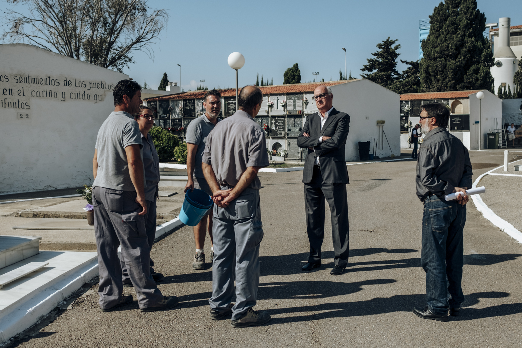 Soler, que ha tenido oportunidad de saludar a los empleados municipales del cementerio y les ha felicitado “por el perfecto mantenimiento en el que está el camposanto”, también ha recorrido el espacio en el que se realizarán las futuras obras de las nuevas manzanas de nichos así como el lugar en el que se ubicará el muro que separa la depuradora del cementerio.